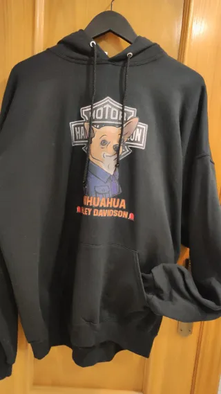 Sudadera con capucha y un diseño personalizado. NO es marca Harley Davidson, sino que tiene un estampado con el logo de la marca. -Calentita y cómoda. - Estampado frontal con un perro chihuahua. - Logo inspirado en Harley Davidson. - Bolsillo canguro delantero.