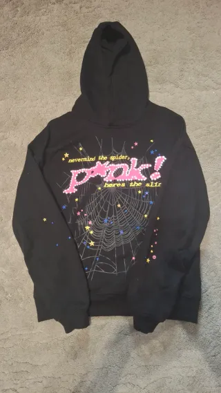 Sudadera con estampado de telaraña y estrellas. Talla S - Diseño frontal con texto pink! y nevermind the spider, heres the slip. - Mangas y parte frontal con detalles de estrellas de colores. - Capucha integrada.