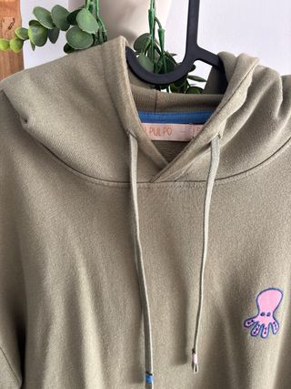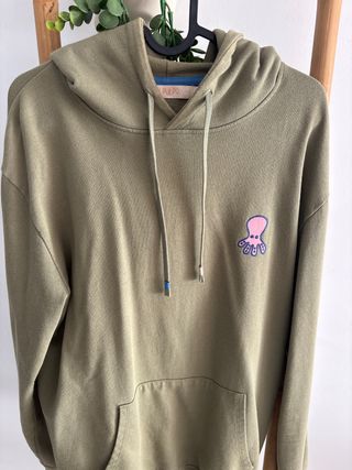 Sudadera con capucha de la marca El Pulpo en color verde militar. Presenta un diseño divertido con un pequeño pulpo bordado en la parte delantera. - Capucha con cordones. - Bolsillo tipo canguro. - Detalle de pulpo bordado.