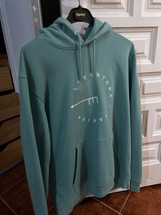 Sudadera con capucha de la marca Levantera, con diseño inspirado en Tarifa. Nueva vale 64.90 Hoodie orgánica premium. - Color verde azulado. - Estampado frontal circular con el nombre de la marca y un diseño gráfico. - Bolsillo canguro. - Capucha con cordones ajustables.