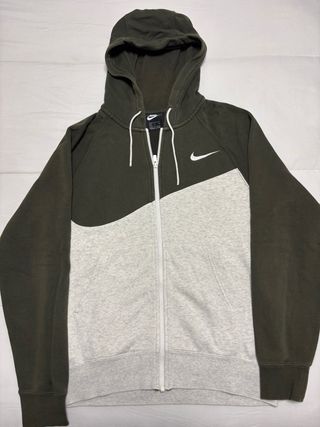 Sudadera con capucha y cremallera completa de Nike. Presenta un diseño bicolor con paneles en gris y verde oliva. - Capucha ajustable con cordones. - Cremallera frontal. - Logo de Nike en el pecho.