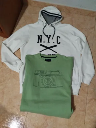 Talla L. Conjunto de dos prendas de ropa para hombre, una sudadera con capucha y otra sudadera. - Sudadera con capucha blanca con estampado N.Y.C, con bolsillos de Sfera. Talla L. - Sudadera verde con estampado de cámara de Springfield. Talla L Precio de las dos 10€, precio unitario 5€ cada una