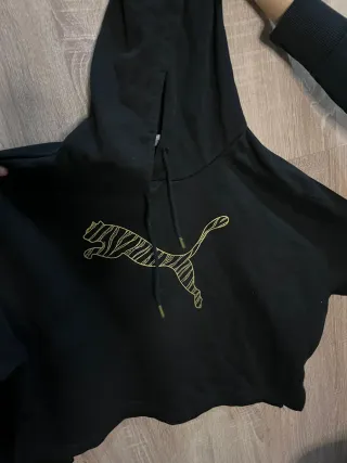Sudadera negra de Puma con un diseño llamativo. - Logo de Puma con detalles dorados. - Capucha con cordones. - Puños y bajo elásticos.