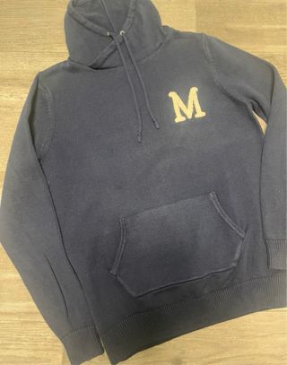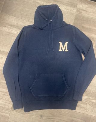 Sudadera de punto en color azul marino con un diseño clásico. - Detalle de letra M en la parte frontal. - Capucha con cordones. - Bolsillo tipo canguro. - 100% algodón.