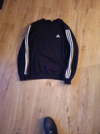 Sudadera clásica de Adidas en color negro, con el icónico diseño de tres rayas blancas en las mangas. - Logo de Adidas bordado en el pecho. - Cuello redondo. - Puños y bajo elásticos.