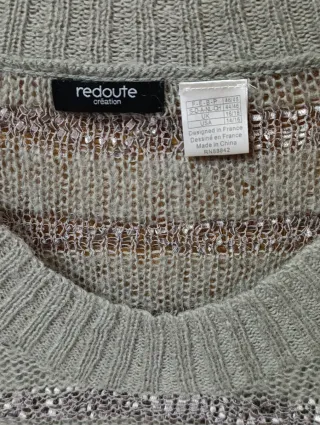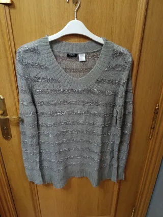 Jersey fino de punto con un diseño de rayas sutiles. Gris y plateado.algo transparente Pecho 55cm, largo 68cm, manga 70 cm y hombro 48 cm. Cuello redondo Puños manga y bajo 48% poliéster, 37% acrílico, 9% nylon, 5% lana y 1% fibra natural de lujo Peso 200grs
