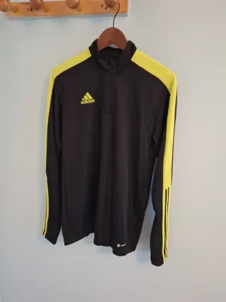 Sudadera deportiva Adidas con diseño moderno. - Cremallera parcial en el cuello. - Mangas con detalles de rayas. - Logo de Adidas en el pecho.