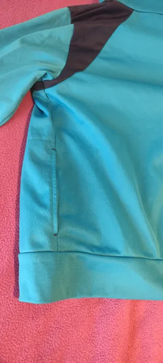 Chaqueta deportiva de manga larga. - Cuello alto con media cremallera. - Diseño con ribetes blancos en hombros y cuello. - Logo de la marca en el pecho.y en la espalda, en perfecto estado talla XL