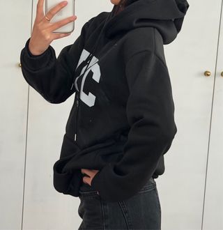 Sudadera con capucha negra - Diseño clásico con bolsillo frontal. - Logo de la marca estampado en el pecho.
