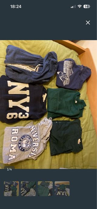 Pack de seis sudaderas con diferentes diseños. - Sudadera azul con cremallera. - Sudadera azul con estampado gráfico. - Sudadera azul marino con NY36. - Sudadera verde con COSTA DEL SOL. - Sudadera gris con ROMA UNIVERSITY. - Sudadera verde oscuro.