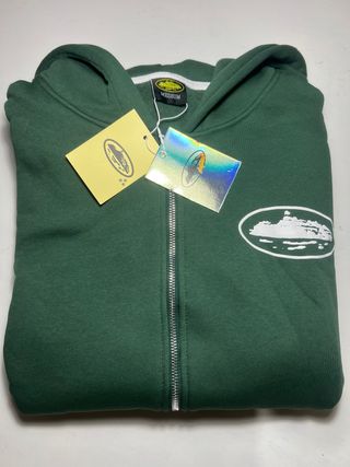 Sudadera con capucha y cremallera completa de la marca Corteiz. - Color verde intenso. - Logo blanco ovalado en el pecho. - Incluye etiquetas originales.