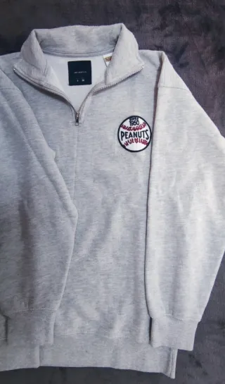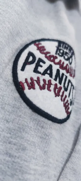 Sudadera estilo vintage con cuello de cremallera y diseño inspirado en el béisbol: - Parche bordado con el logo de Peanuts y el año 1950 en la parte frontal. - En la parte trasera tiene una ilustración tal cual se ve en las fotos. - Cuello con cremallera. - Tejido suave y cómodo. - No tiene ningún tipo de mancha ni roturas. Está como nueva. Para cualquier consulta o duda no dudes en contactar conmigo ☺️