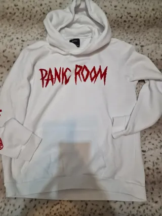 Sudadera con capucha de Bershka, talla XL. Presenta un diseño llamativo con el texto Panic Room en la parte delantera. - Diseño con capucha. - Bolsillo frontal tipo canguro. - Puños y bajo elásticos.