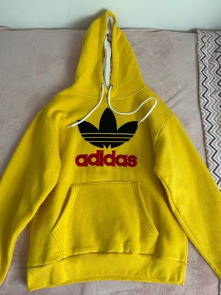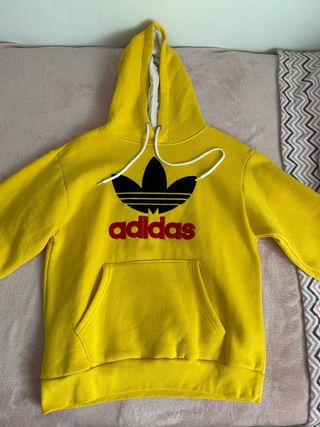Sudadera Adidas en excelente estado. Color amarillo brillante con logo grande al frente en negro y rojo. Muy cómoda, suave por dentro y perfecta para uso casual o deportivo. ✔ Marca: Adidas ✔ Color: Amarillo ✔ Con capucha y cordones ajustables ✔ Bolsillo frontal tipo canguro ✔ Muy buen estado