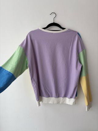 Sudadera vintage con un diseño colorido y llamativo. - Combinación de colores azul, morado y turquesa. - Tejido polar suave y cálido. - Bolsillo frontal tipo canguro. - Cierre de cremallera parcial en el cuello.