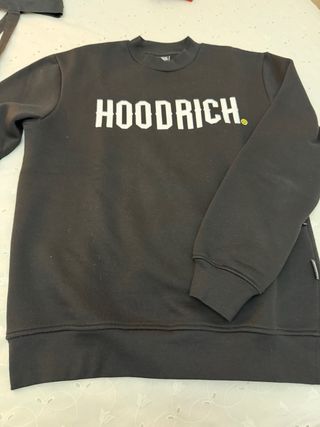 Sudadera de la marca Hoodrich en color negro y talla S. Presenta un diseño moderno y cómodo. - Logo de la marca en blanco en el pecho. - Cuello redondo. - Puños y bajo elásticos.