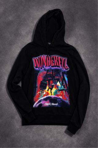 Sudadera con capucha y un llamativo diseño gráfico en la parte delantera. - Estampado Wonderful con detalles de colores vibrantes. - Ilustración de una figura en un paisaje futurista. - Texto adicional (Skrt, Skrrt) en la parte inferior del diseño.