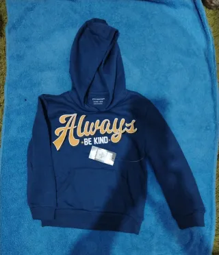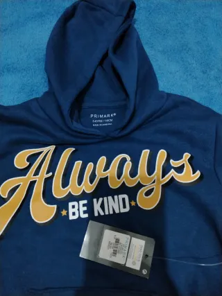 Sudadera azul con capucha y estampado. Talla 5 y 6 años 116 cms - Diseño Always Be Kind. - Bolsillo frontal tipo canguro.