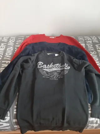 Conjunto de tres sudaderas con diferentes diseños. - Sudadera gris con estampado Basketball y detalles de alas. - Sudadera azul con estampado camuflaje. - Sudadera roja lisa.