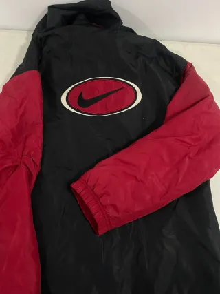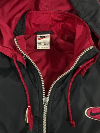 Chaqueta deportiva estilo retro con un diseño llamativo. - Mangas de color rojo. - Cuerpo principal en color negro. - Logo ovalado de Nike en el pecho.