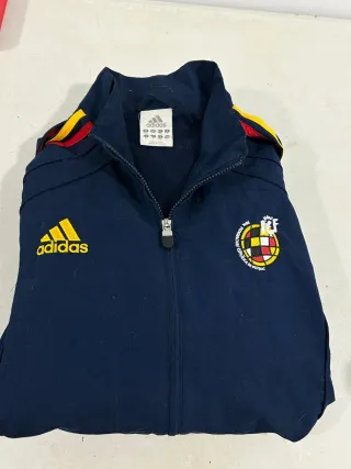 Chaqueta deportiva retro de Adidas. - Diseño clásico con los colores de España. - Logo de Adidas en amarillo. - Escudo de la RFEF bordado.
