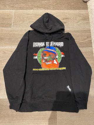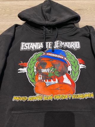 Sudadera con diseño del Frente Atlético. - Color negro. - Estampado frontal con escudo y lema. - Capucha y bolsillo delantero. - Sudadera de bufandea. - En perfecto estado, sin manchas ni imperfeccciones.
