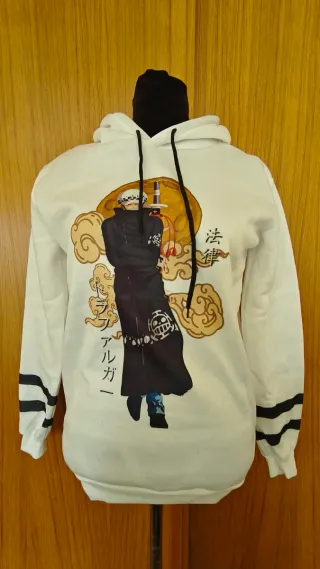 Sudadera con un diseño inspirado en anime. - Estampado frontal de personaje. - Mangas con detalles de rayas negras. - Capucha con cordones negros. - Talla S