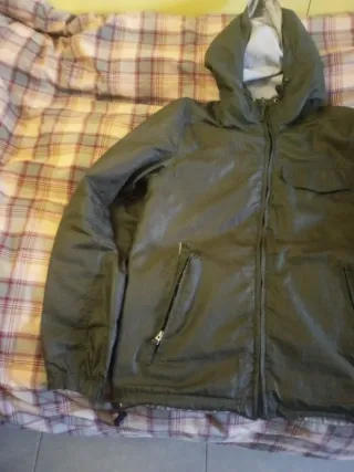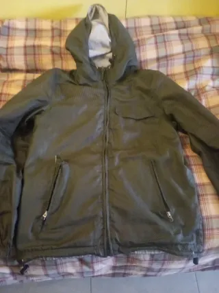 Chaqueta con capucha en tono verde oliva. Presenta un diseño moderno y práctico. - Cierre de cremallera frontal. - Dos bolsillos laterales con cremallera. - Bolsillo superior con solapa. - Cordón ajustable en el bajo.