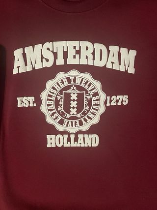 Precio dispuesto a negociar. Descuento por lotes. Sudadera de color granate con el texto “Amsterdam” en el pecho. Diseño cómodo y urbano, ideal para entretiempo o días frescos. Se ajusta cómodamente al cuerpo, y es caliente. Detalles: 📏 Talla M 🍷 Color granate con letras en blanco 🧵 Interior afelpado, tejido suave ✨ Estilo casual y oversize 🧼 En muy buen estado, sin manchas ni signos de uso Envío rápido y seguro. Hogar sin humo ni mascotas.