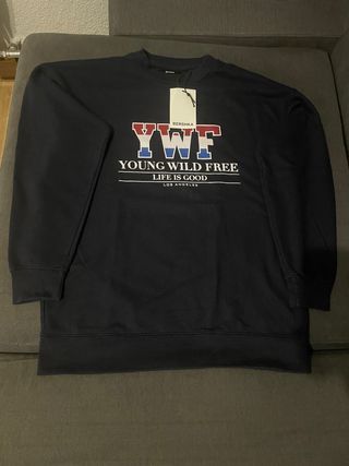 Precio dispuesto a negociar. Descuento por lotes. Sudadera casual con estampado “Young Wild Free (YWF)” en el frontal, ideal para un look urbano, desenfadado y moderno. Se ajusta cómodamente al cuerpo. Detalles: 📏 Talla M 🎨 Color predominante oscuro con estampado llamativo 🧵 Tejido cómodo y suave al tacto ✂️ Corte clásico, muy fácil de combinar Estado: ✅ En muy buen estado, sin manchas, roturas ni señales de desgaste visibles. ✅ Estampado bien conservado, sin grietas ni descascarados. Envio rápido y seguro.
