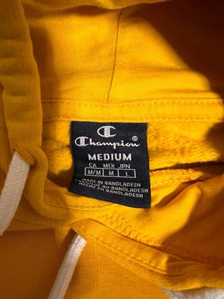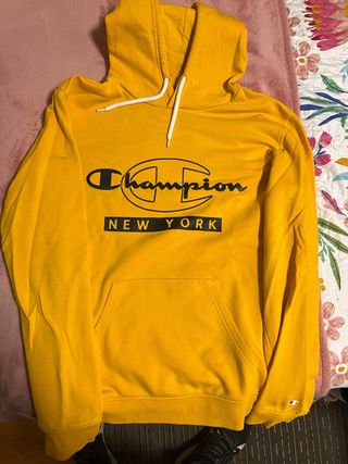 Sudadera Champion de color amarillo vibrante con el logo de la marca y New York estampado. Talla M - Diseño con capucha y cordones. - Bolsillo frontal tipo canguro. - Pequeño logo de Champion en la manga.