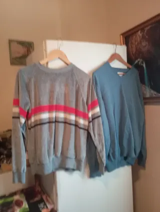 Conjunto de dos jerseys para hombre. - Jersey gris con rayas rosas, blancas y negras. - Jersey azul de cuello pico.