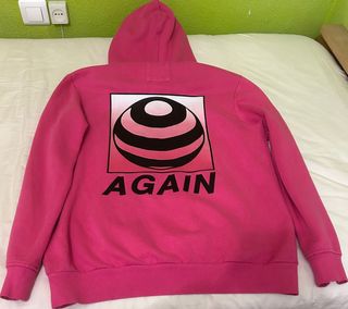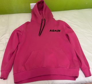 Sudadera con capucha de color rosa vibrante. Presenta un diseño moderno con un bolsillo canguro en la parte frontal y cordones negros en la capucha. - Logo AGAIN en la parte delantera. - Puños y bajo elásticos.