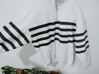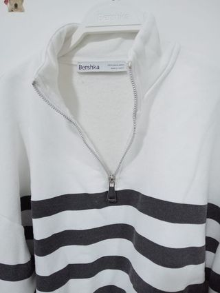 Sudadera de Bershka con un diseño de rayas horizontales en blanco y negro. Es una prenda cómoda y versátil. Solo 2 usos. - Diseño de rayas. - Cuello con cremallera.