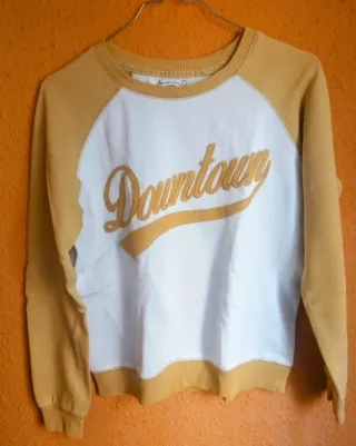 Sudadera de manga larga con diseño Downtown bordado en el pecho. Combina paneles blancos con mangas y cuello en amarillo. - Diseño tipo raglán. - Cuello redondo. - Puños y bajo elásticos.