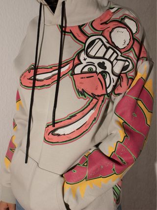 Sudadera con capucha y un llamativo estampado. - Diseño gráfico de conejo con gafas. - Mangas con detalles de graffiti. - Cordones negros para ajustar la capucha. PRECIO NEGOCIABLE