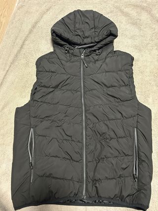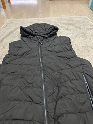 Chaleco acolchado con capucha de Bershka. - Cierre de cremallera frontal. - Dos bolsillos laterales con cremallera. - Cordones ajustables en la capucha.
