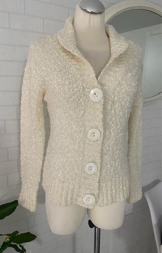 Cárdigan de punto en color blanco, talla M. Presenta un diseño texturizado y cierre de botones. - Cuello solapa. - Puños y bajo de canalé. - Botones nacarados.