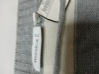 Jersey de punto con un diseño de rayas horizontales en diferentes tonos de gris y blanco. El cuello es alto y acanalado. - Diseño de rayas degradadas. - Tejido de punto grueso. - Calentito La talla es una S pero es más bien M o L estrecha (ancho 50, largo unos 60)