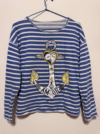 Jersey de manga larga con estampado de ancla y corazón. - Diseño de rayas azules y blancas. - Estampado central con ancla, corazón y AMOR. - Cuello redondo.
