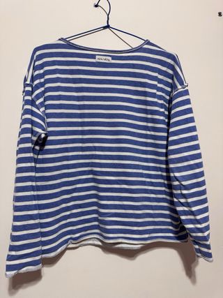Precioso jersey de rayas de color azul y blanco roto detalle de apertura en puño