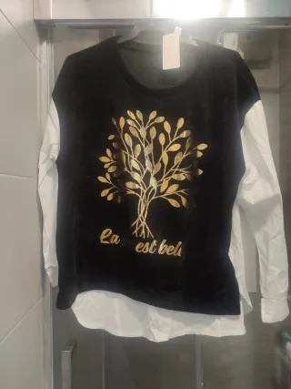 Jersey de mujer con un diseño original y moderno. Combina un tejido negro con detalles en blanco. - Estampado de árbol dorado en la parte delantera. - Inscripción La vie est belle en dorado. - Mangas y parte inferior en blanco.