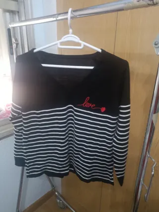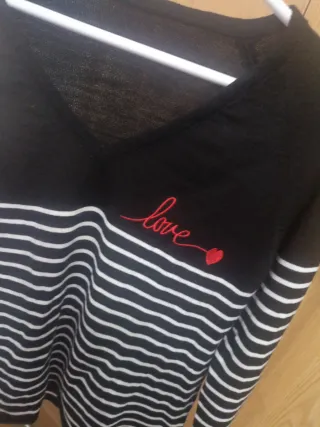 Jersey de rayas con un diseño moderno y llamativo. - Cuello en V. - Detalle de love bordado en rojo. - Pequeño corazón rojo. - Manga larga.