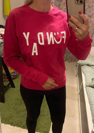 Sudadera color fucsia de Alcott. Talla S. Con letras en blanco efecto poli piel pegado. Puesta en una ocasión está impecable.