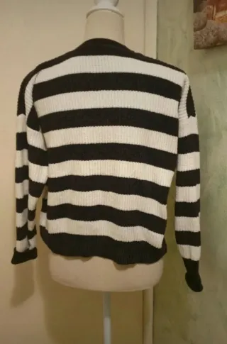 Jersey de rayas en blanco y negro de pelito, acrílico y algo elástico con cuello de barco, mangas anchas y con corte en la cintura para ajustarlo, talla L