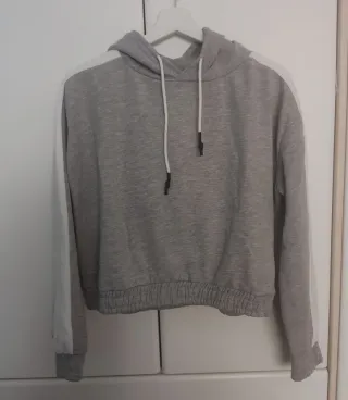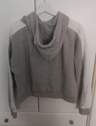 Sudadera corta de estilo deportivo, gris con capucha . Tiene una linea blanca en las mangas. Talla M de Lefties