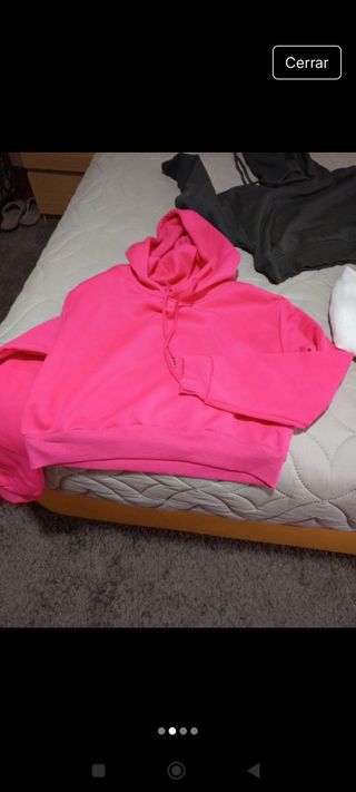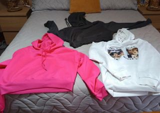 Conjunto de tres sudaderas.Talla S la oscura M pero talla como las otras ,como una S.Las cortas cómo nuevas ,la blanca más usada. - Una sudadera rosa brillante. - Una sudadera blanca con estampado. - Una sudadera gris oscuro.