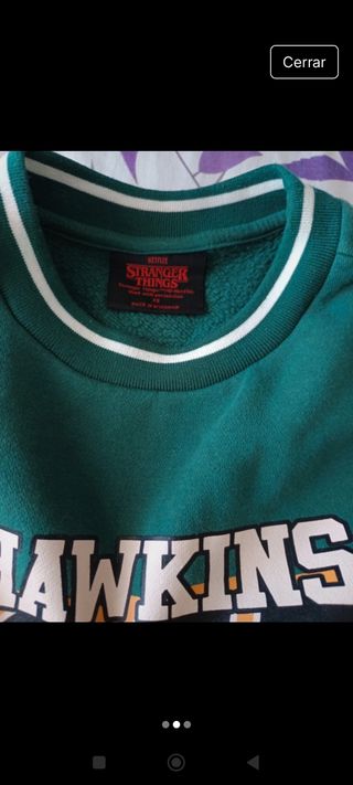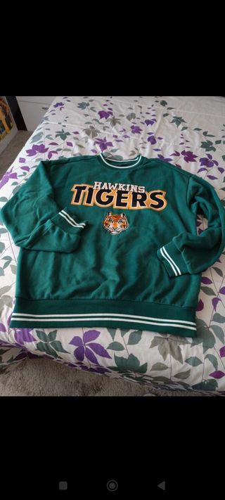 Sudadera con estampado de los Hawkins Tigers y un diseño inspirado en Stranger Things. - Diseño oversize. - Estampado frontal de Hawkins Tigers con un tigre. - Puños y bajo con detalles de rayas blancas.