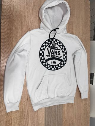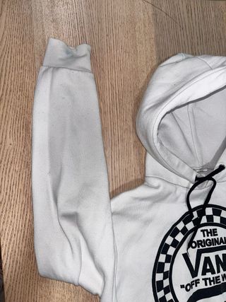 Sudadera con capucha de la marca Vans en color blanco y talla M. Presenta un diseño circular con el logo de la marca. Pequeña marca en las dos mangas, en una una marca como se puede ver en las imágenes, de boli y la otra lo mismo pero más pequeña. - Logo circular con Vans y Off The Wall. - Capucha con cordones negros. - Bolsillo canguro delantero.