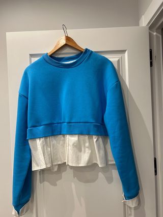 Jersey finito azul con detalle de flores azul oscuro y acabado en camisa blanca. Talla S marca Springfield. Posibilidad de venta en persona.